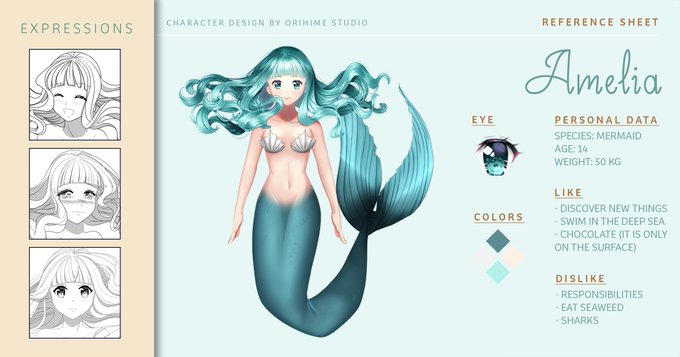 I finally made time to make a reference sheet for Amelia! She is my OC, I included general details of her personality. With luck I will be able to develop this character more in the future 😊 - #mermaid #originalwork #DigitalArtist