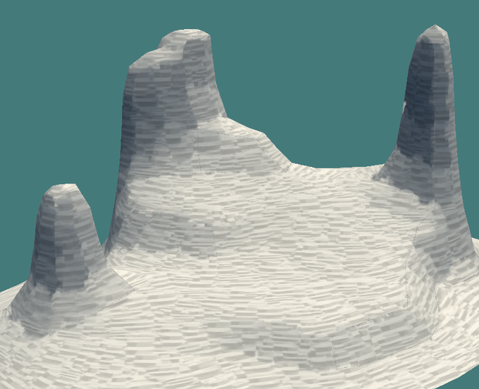 With his kind of approach you can align decal features to the terrain. Here, I'm drawing strokes either along or across the slope. This kinda thing would be really hard to achieve with a standard tiling textures approach.