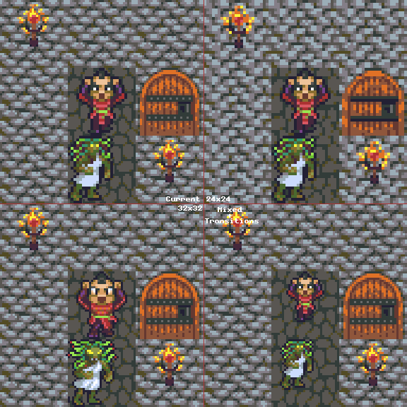 Experiments with resolution! Before settling on (duh) 1:1, I played around with mixing resolutions, with the motivation of having sprite match the size of the tile. The horrific lessons herein illustrate why we don't do weird stuff like this.🤷#pixelart #gamedev