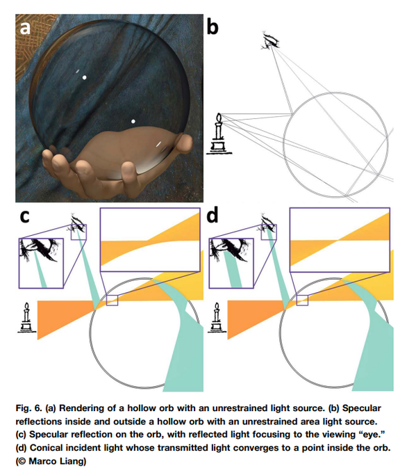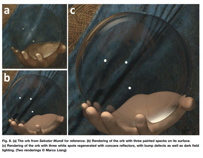 Absolutely love this SIGGRAPH '20 paper: explanation of the illumination in Salvator Mundi especially the three white spots in the orb. The optical accuracy of the painting has cast doubt on the attribution to da Vinci, but this paper shows it's correct. https://t.co/UGCZmtbaih