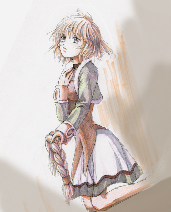季節お題【没キャラ(没デザイン)】#PF版深夜の真剣お絵描き60分一本勝負 髪の短いウェンディー。デザインは好きなのですが意味なく自らの目印を切って欲しくなくて。そんな妄想していたらもう会えないヒトに自らの分身を捧げる絵になりました