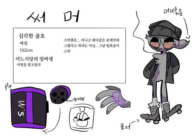 @black_pain999 헐네 네 일단 이름은 ‘써머’라는 애고 골초(;;)에다 식당알바생이에요 여캐고 키는 184정도되는 애에요! 이건 무기랑 손등의 모습