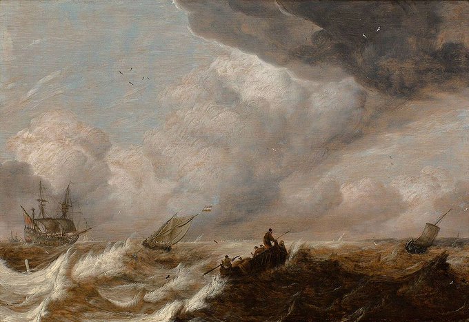 Abraham van Beyeren, whose day is today, was more than just a painter of marvelous luxuries: here, ships in a squall, 1650, equally evocative in totally different way.