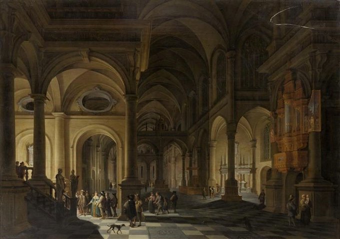 Beautiful mystery of a church at night, with figures. And dogs. By Gerard Houckgeest, whose day has been today.