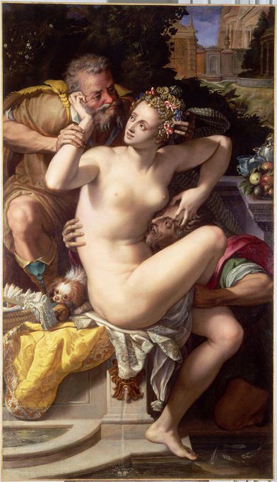 Susanna with two particularly vile Elders, and a little dog getting squished in between. Bad times from Alessandro Allori of Florence, born OTD in 1535.