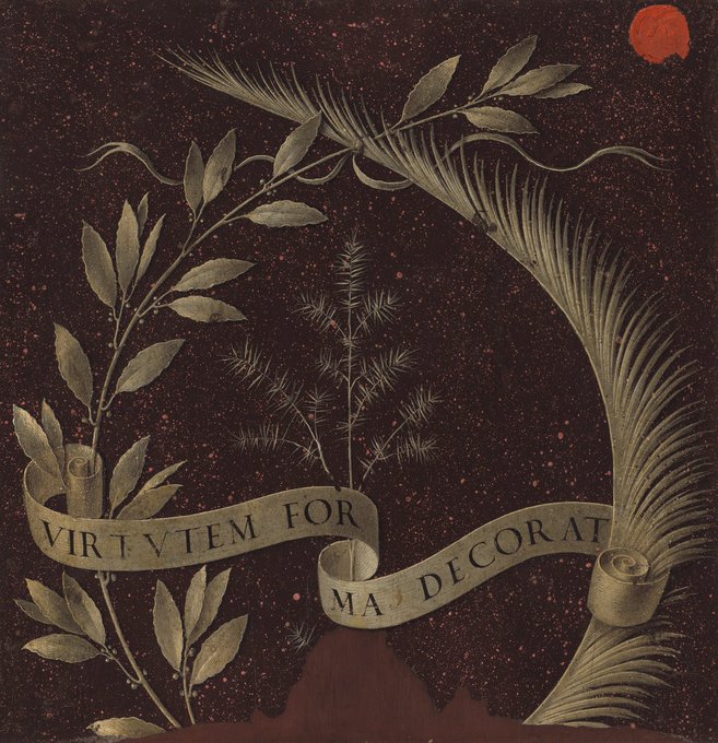 2/2 On the back of Ginevra's portrait: laurel wreath, palm, sprig of juniper, and motto virtutem forma decorat (virtue adorns beauty). Her inner beauty as signified by Leonardo, whose day is today.