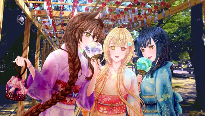 この同期三人組好きだ!!!!! 浴衣のデザインめちゃ考えた0(:3 )~ ('、3_ヽ)_ #織姫星 #カルタの絵札 #サラ星図 #恋フミ