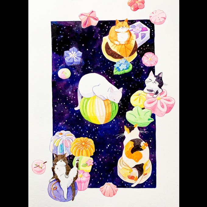 New painting of cat and namagashi :) #namagashi is a traditional Japanese sweets serve with tea, they are so elegant and too pretty to eat! I don’t think my painting captures half of how beautiful they are #watercolor #cats #painting #artoftheday #sweets #dessert #mochi