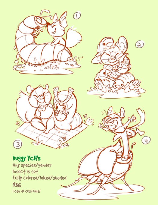 Next batch of buggy YCH's! Any species/gender, fully lined/colored/shaded $36 each~ please DM me if you'd like one, first come first serve!