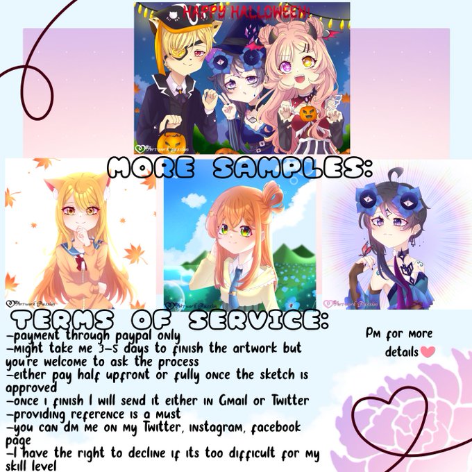 Hello~ this is my first time doing this so I'm a bit nervous, pls do dm me for more details and if you are interested. Also if you can't commission me then thats ok! retweets are highly appreciated <33