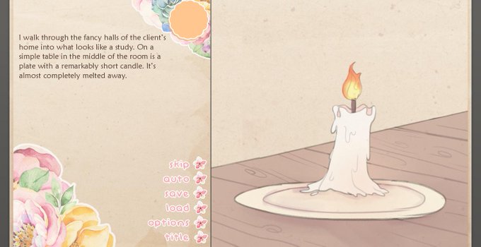 The current demo for Floret Bond has plain sketches for the CGs. We’re now in the process of replacing those with colored CGs that closer match the normal sprite style. They’re very pretty ❤