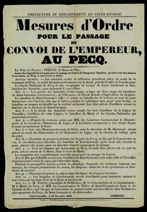 Découvrez le plan et les mesures d'ordre prises en 1840 pour le passage des cendres de Napoléon rapatriées aux Invalides par le pont du Pecq.
