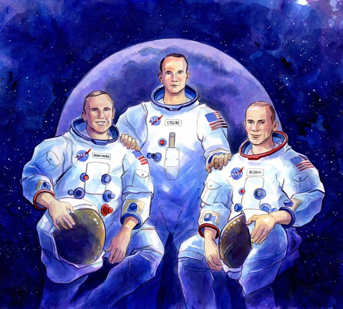 50 years ago today this crew anded two of them on the Moon and inspired the whole World. My illustration is obviously based on the classic pose but I wanted to put @AstroMCollins with his hands on the shoulders of Neil Armstrong and @TheRealBuzz. Thanks Apollo you were awesome!
