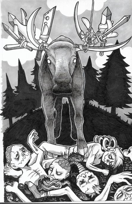 #inktober2017 A moose with swords tied to it's antlers for mowing down zombies. Basically, I drew a personally fantasy of a Wal-Mart coworker.