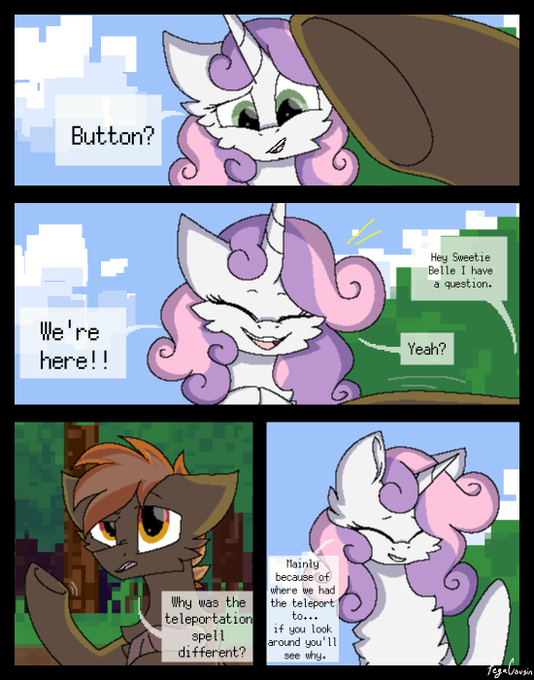 on button mashes 21st birthday sweetie Belle comes over to his house and she has a gift for him, the gift is that she is able to have both of them teleport into Minecraft for a whole month And the comic is about what they do in Minecraft or whatever