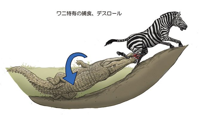 ワニは噛みつく力は強いが引き裂く力はそれほど強くないので、獲物を引き裂くために「噛みついたまま全身を回転させて引きちぎる」という「デスロール」を行う。