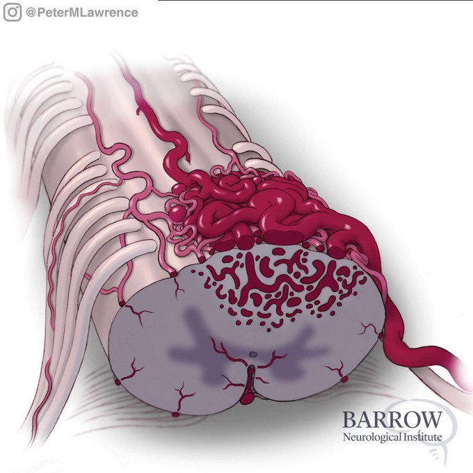 Illustration of a glomus spinal AVM. The extrapial portion of the AVM nidus has been resected, leaving the parenchymal portion of the nidus. The glomus spinal AVM has been essentially devascularized and obliterated. By Mark Schornak @BarrowNeuro @neuroangio1 @spinesection
