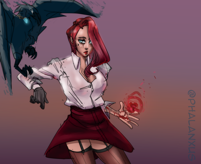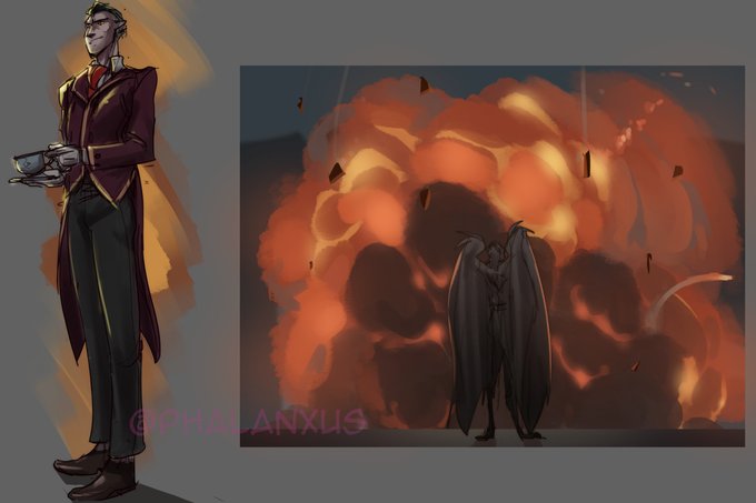 Today's practice pieces. Needed to study one of my OCs called Miles for some future scenes with explody stuff. On the right Elisabeth with her raven familiar Deimos.