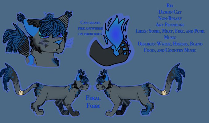 @ghcstbite Rix likes to set small fires for fun and just watch the little flames burn but then they get bigger and he panics because he forget he can put them out. And Arson can speak perfect english but they like to pretend they're a feral dog and just bark at random others and then