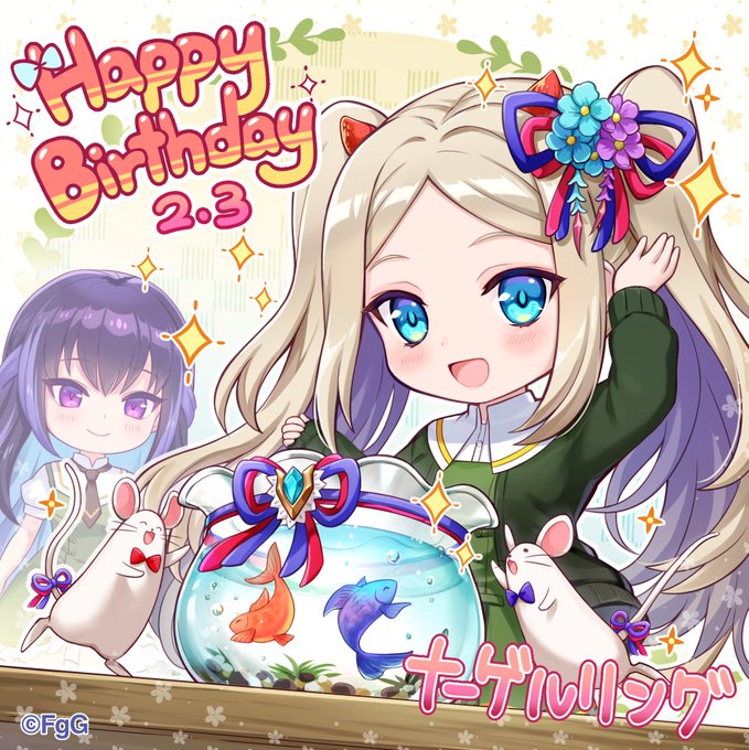 本日2/3はナーゲルリングの誕生日🎉フォルカスから和風の髪飾りと、さらにペットのランチとディナーにリボンをプレゼント😆早速身につけ大和撫子な装いのナーゲルリング、一方お供の二匹は金魚に興味津々な様子💖彼らの友情が生まれる瞬間を微笑ましく見守る飼い主二人なのでした😊 #ファンキル