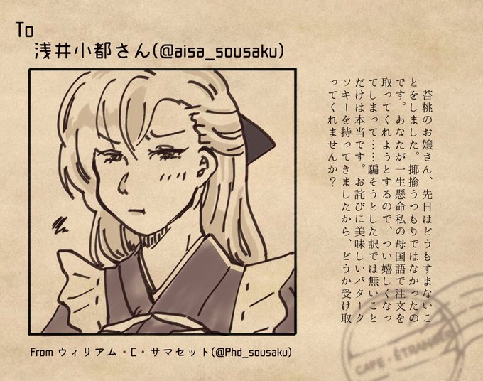 先日はタグ反応ありがとうございました。覇柄さんも玲さんも大好きです(挨拶)ウィリアムの飼っている犬の名前は枇杷丸と言います。玲さんは猫ちゃん達にお名前つけているのだろうか……