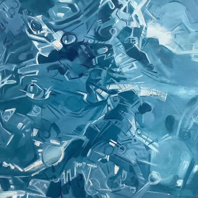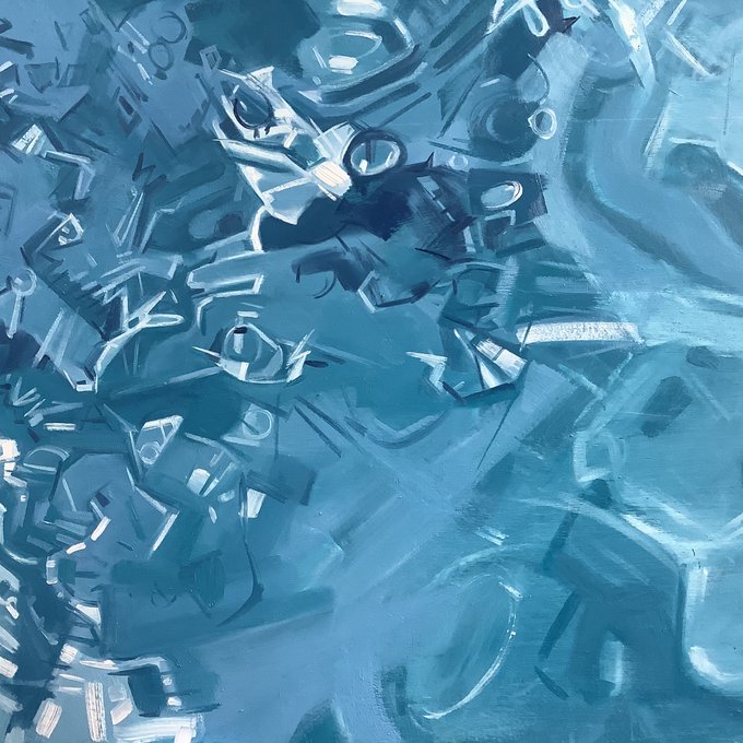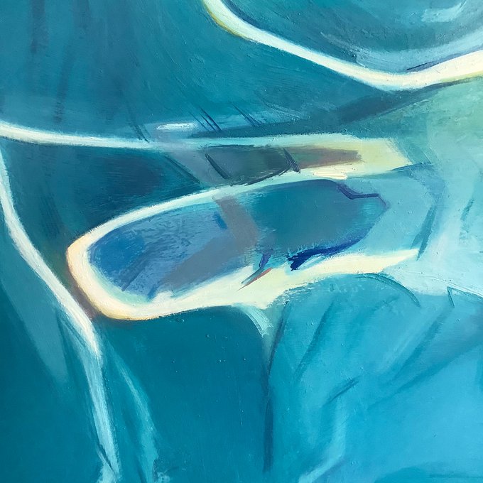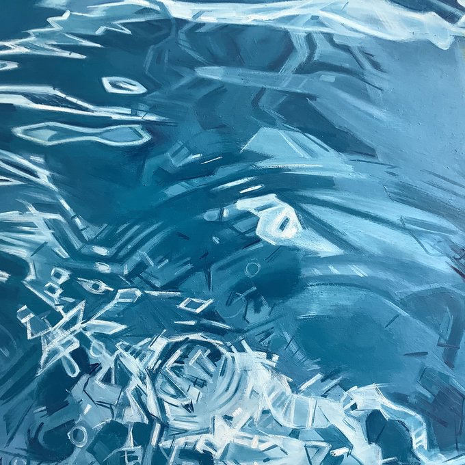 Yes, I am depicting the surface of the water but also the pattern of the light on the pool floor underneath. Trial and error. 🤨#swimmingart #oilpainting #oilonwoodpanel #inthestudio