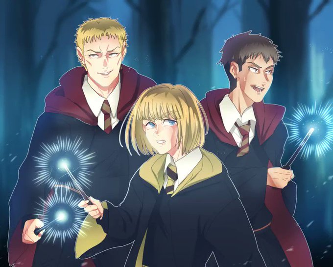 We did again secret art trade and this time my secret easter is @lunorichi bby, she wanted Reiner, Armin and Jean as HP Crossover 🧙♂️✨What are they looking for on Forbidden Forest? Maybe are on seeking someone, who knows! #進撃の巨人 #HarryPotter