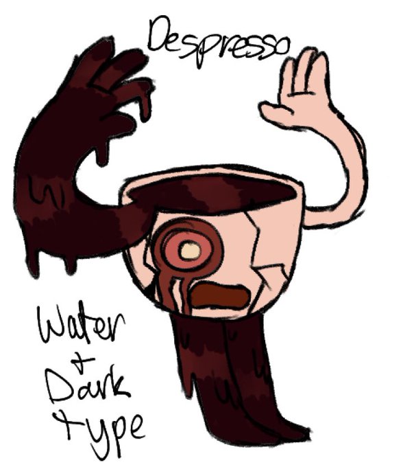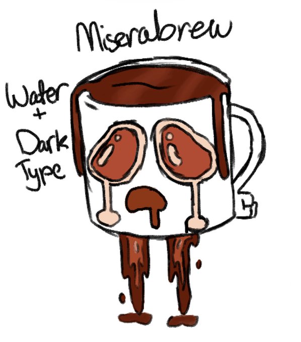 made an evolution line of fakemon based on coffee/different coffee types, so meet miserabrew, lachryatte, and despresso! theyre all water/dark typed pokemon