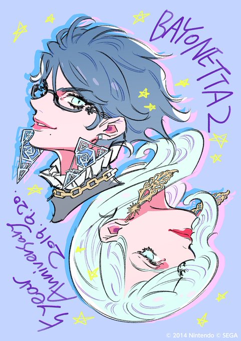 Bayonetta character designer Mari Shimazaki drew this picture of Bayonetta and Jeanne to commemorate the launch of Bayonetta 2. Originally in black and white, now in color to celebrate the game's fifth anniversary! #Bayonetta2 #Bayonetta