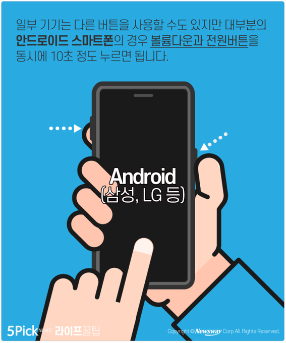 안드로이드 기기 (갤럭시, 샤오미, LG폰 등등 아이폰을 제외한 대부분의 스마트폰)에서 사용할 수 있으나 버전이나 제조사, 기기 시리즈별로 상이할 수 있습니다. 아이폰의 경우 ~6S모델은 홈+전원, 아이폰 7은 볼륨다운+전원, 아이폰 8부터는 볼륨업 한 번, 볼륨다운 한 번, 그리고 전원 길게 꾸욱. https://t.co/Qu370j6cSg