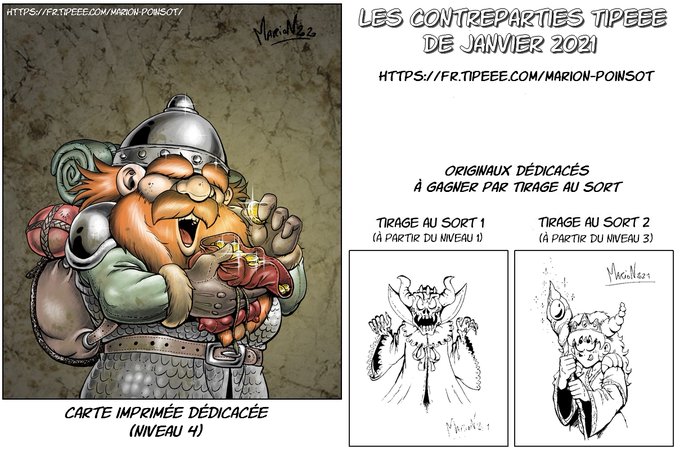 Les contreparties Tipeee de Janvier 2021 ! La carte dédicacée avec le Nain de Naheulbeuk, et les originaux à gagner par tirage au sort.