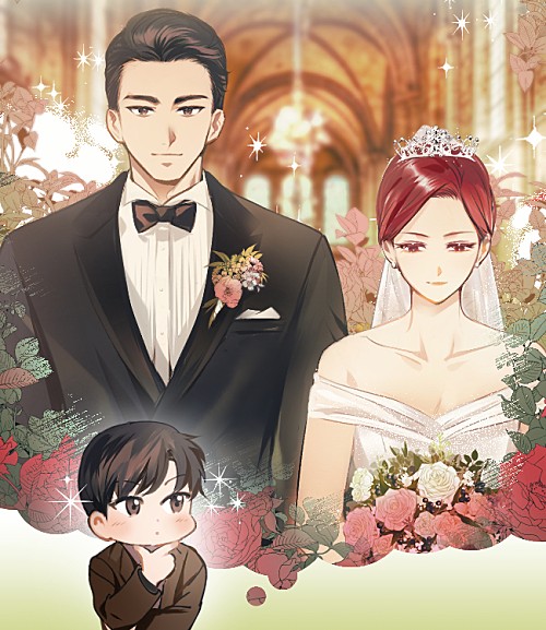 So this cover is from a photoshoot requested by a child where the main leads are wearing clothes commonly worn in weddings and the teddy bear is from Stella (child) cuz she thought that Rajin (fl) will need this even if Stella treasure the teddy bear so much I'm crying