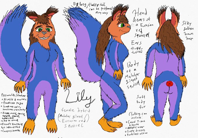 @kemonokapi Beavers are fairly uncommon in the fandom, but even less common are Malabar giant squirrels (Lily is a hybrid between a Malabar and a Eurasian red squirrel). Flying squirrels aren’t super common either.