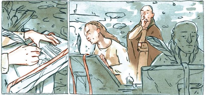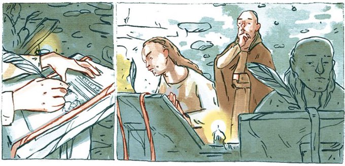 The pious and cunning priest, Ronan Finn, in his scriptorium. From SWEENEY'S PROGRESS, art by @inksplattery, script by @GDRNorminton. You can help us make the book a reality via Patreon: https://t.co/pbj6TfCSV9