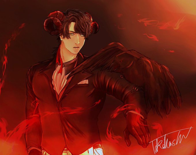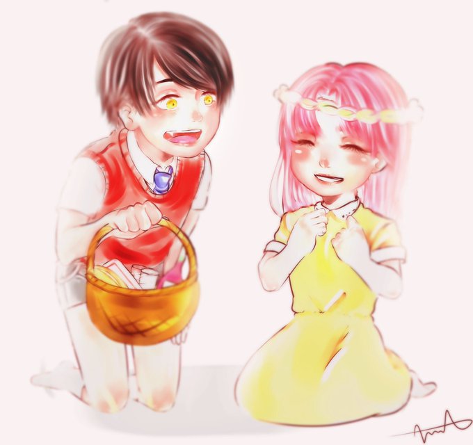 これはあもんくん(吸血鬼)の話なんですけど、一枚目がアモンくんの幼少期でピンクの子が幼なじみなんですけど、2,3枚目はあもんくんなんですよね