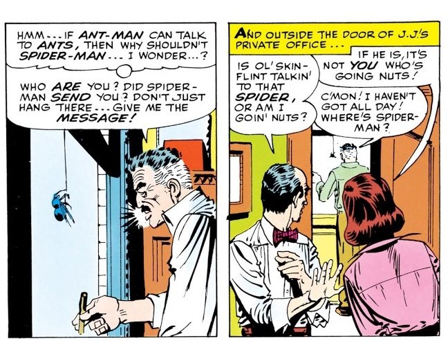 Knowing Ant-Man's gimmick, Jameson tries to talk to a random spider in order to communicate with Spider-Man.