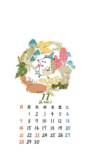 11月のカレンダー🗓できました。 キノコ帽子できのこ狩り🍄 (個人利用の範囲内でお楽しみください) #カレンダー #art_月日 #ハリネズミ #きのこ