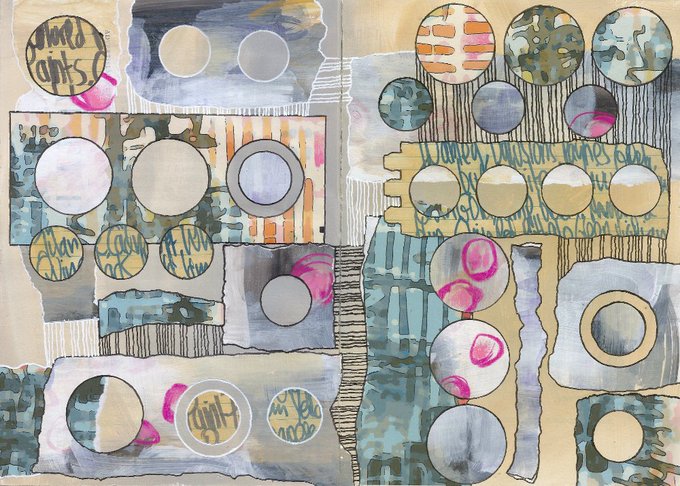Circle collage. My own papers; Pitt pen, Posca pen; with a few pops of bright pink in coloured pencil. #purplepi #purplepistudio #art #abstractart #abstractpainting #mixedmedia #contemporaryart #intuitiveart #painting #artjournal #sketchbook #abstractcollage #collage #alteredbook