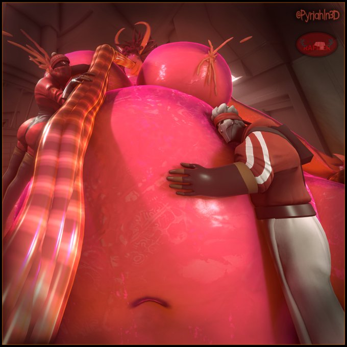 Rafi & Amara (@RafilerSFM) placate Subject 10-37 for good… By letting her stuff herself silly with a dozen barrels of molten caramel 'til she's big enough to lie on! 🥰🧡