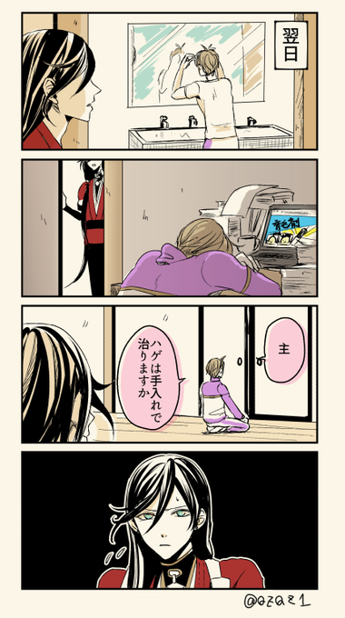暑い暑い唸ってたら、みかねて髪を結ってくれたけど、ちょっとこの髪型はどうなんだよと文句言いたいけど言えない兼さん