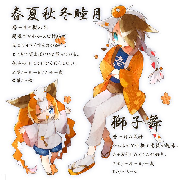 一月の春夏秋冬睦月です。式神の獅子舞もよろしくお願いします! #暦擬人化企画