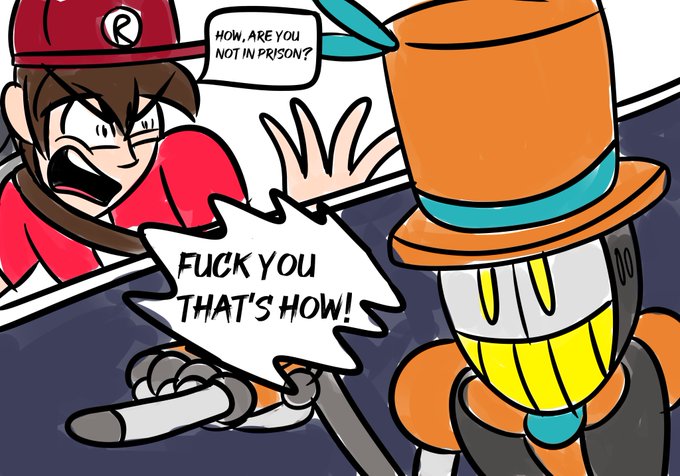 @KiddBreaker1 Here's Apfelsine. He's a robot butler (not a very good one), who has committed various offenses and is kind of insane. He's loyal, but still mad.