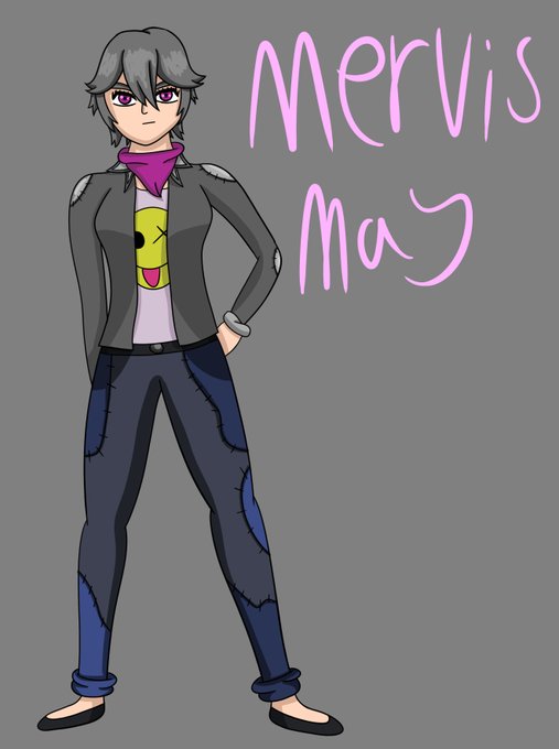 @aidancoreart Her name's Mervis. The second image is a redesign of her hair, face and jacket, but her clothes are mostly the same.