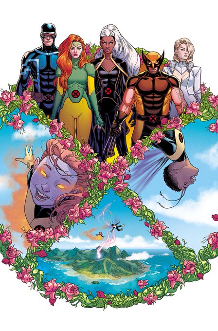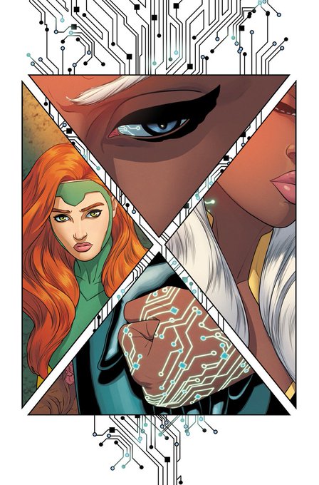 I wanted both of my GIANT-SIZE X-MEN issues to start with a graphic X layout. JEAN + EMMA’s is circular and flowery — meant to portray Krakoa as a mutant paradise. STORM’s is angular and stiff, with circuitry behind — trying to get across a claustrophobic and robotic feeling. ❌