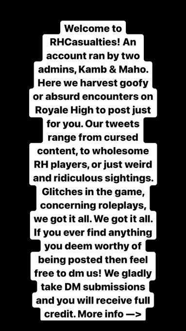 Hello and welcome to RHCasualties! Hope this helps you understand how things work around here. 😈 I will also put all of our official accounts here. Any others you see aren’t us! @RHCasualties2 @_Cursed_Chan_