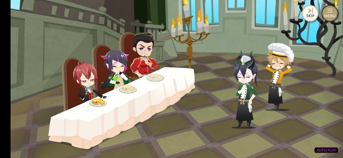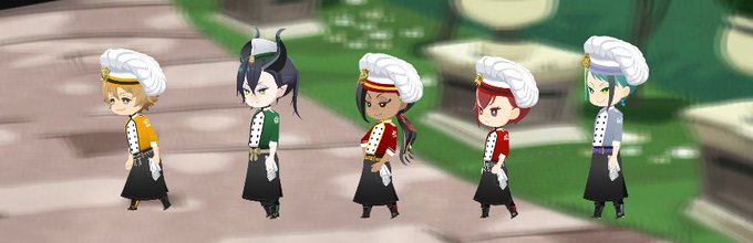 お試しキッシュの試食メンバー&最初の調達組。 見習いシェフの衣装、あとはポムとイグニですね。 イグニ出るのか?おると君の衣装は?兄ちゃんがギア作るのか??
