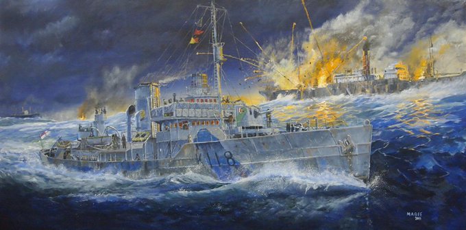 #OTD/1942 in #RCNHistory -Battle for Convoy ONS154 begins. In a 7 day running battle HMCShips ST. LAURENT, BATTLEFORD, CHILLIWACK, NAPANEE, SHEDIAC & KENOGAMI engage 21 UBoats. 14 of 46 merchant ships are lost w/ 551 sailors killed, 1 UBoat sunk. @MMageeArt painting.