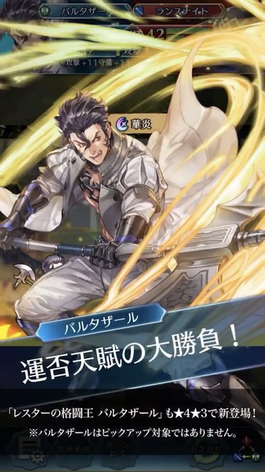 このゴリゴリに記号化されたキャラの味付けは苦手、というかむしろ嫌いだが、性能はエグい。 嫁カチュアと組ませて騎馬だけど上手い事いくように運用したら受るのは不可能ではないだろうか…。護手殺しを意識してるんだろう🤔 バルタザールも★4で出るそう。 ステータス気になる‼︎ …以上、雑感😉