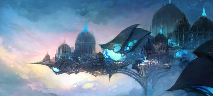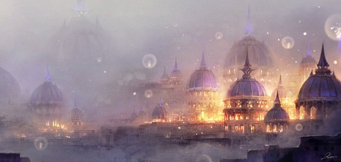 黄金都市の絵の 完成絵/ラフ画 ラフの時点で決めた光や色合いは変えることなく ・書き込む時に影の部分に色を足して暗い部分を豊かに描写する ・デティールを追加するのはメインの建物のみで他はシルエットが分かる程度に押さえる ・光はちょいやり過ぎくらいに盛って光らせる を意識してます