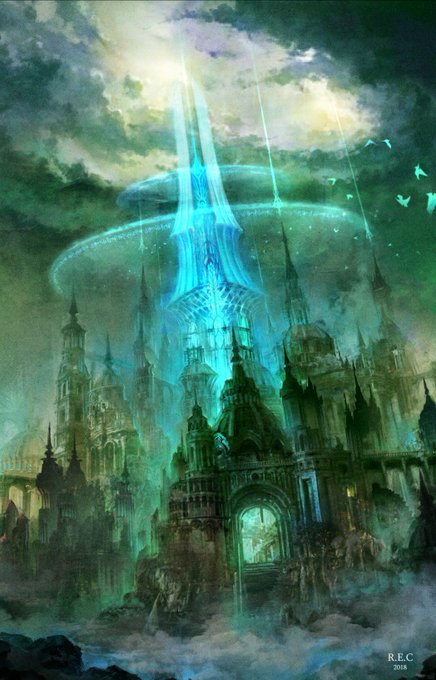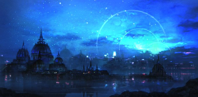 新規絵下書き! 銀河の街なのに朝焼けみたいな光でなんとも不思議な感じ。青が綺麗に決まって嬉しい!